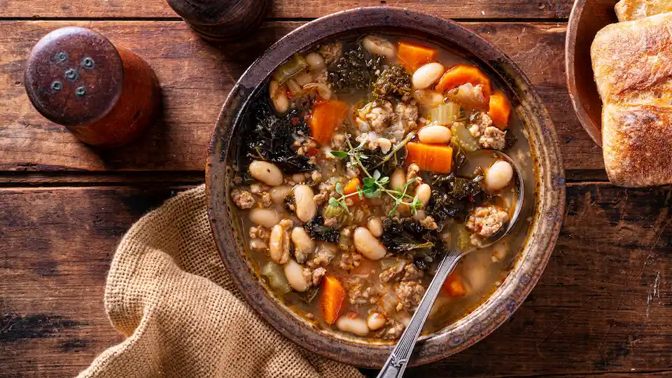 - Return the turkey to the pot. Add broth, beans, thyme, bay leaf, salt, and pepper. Bring to a boil, then reduce heat and simmer for 15 minutes.